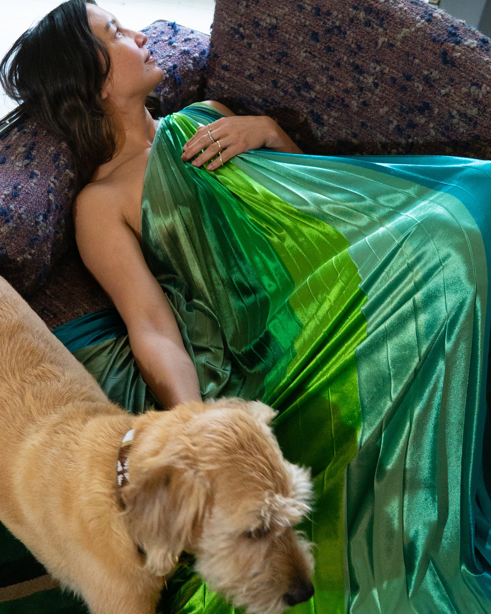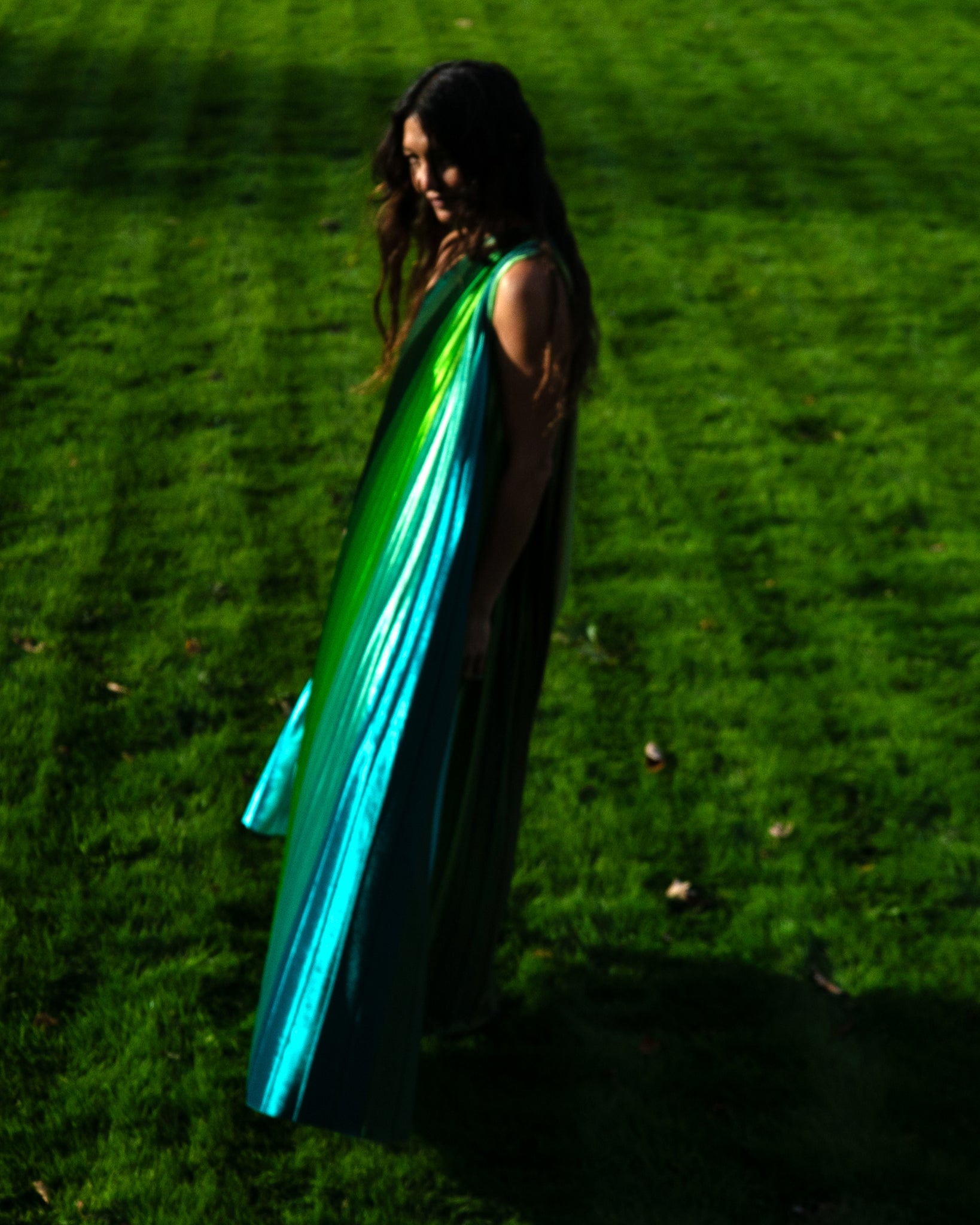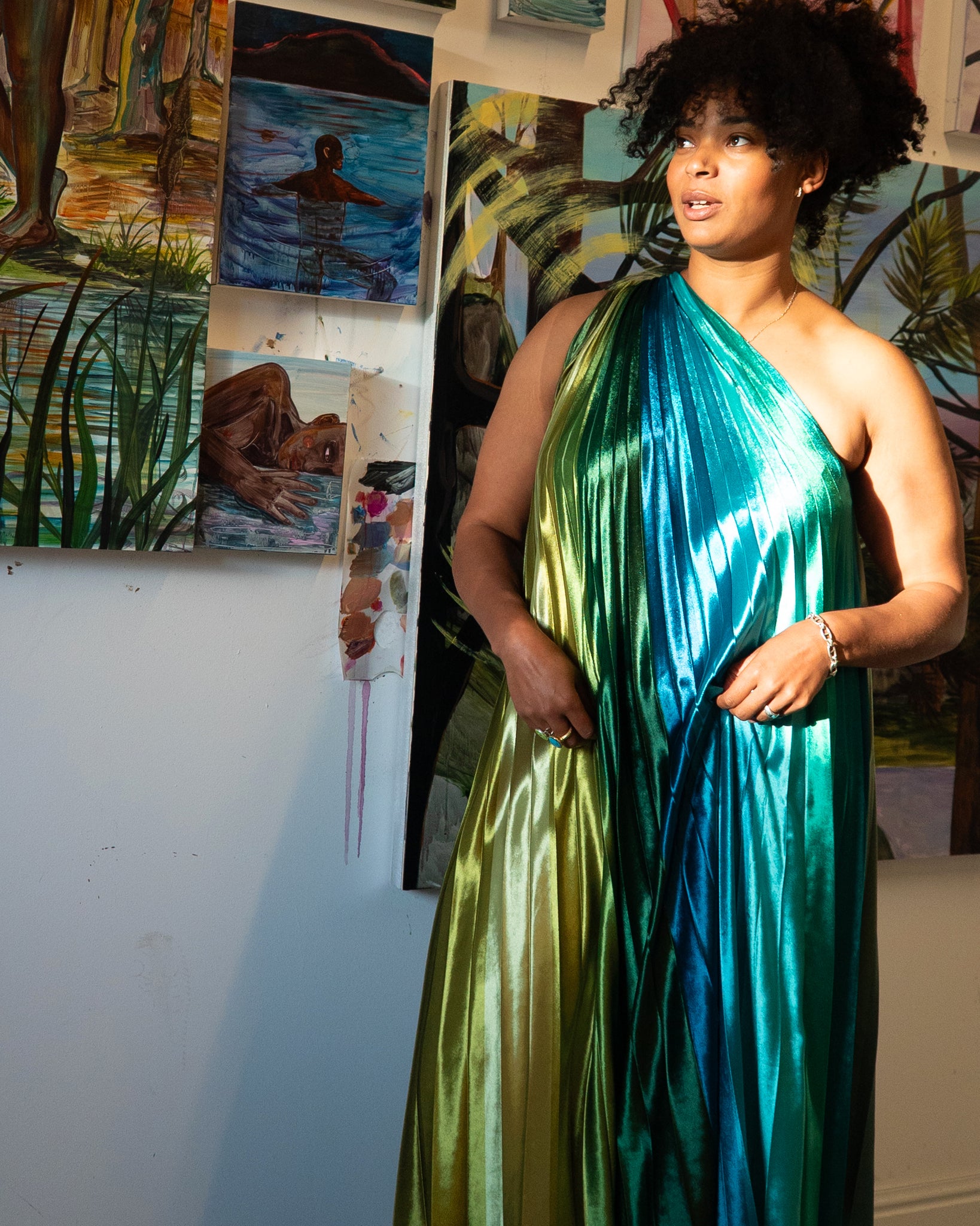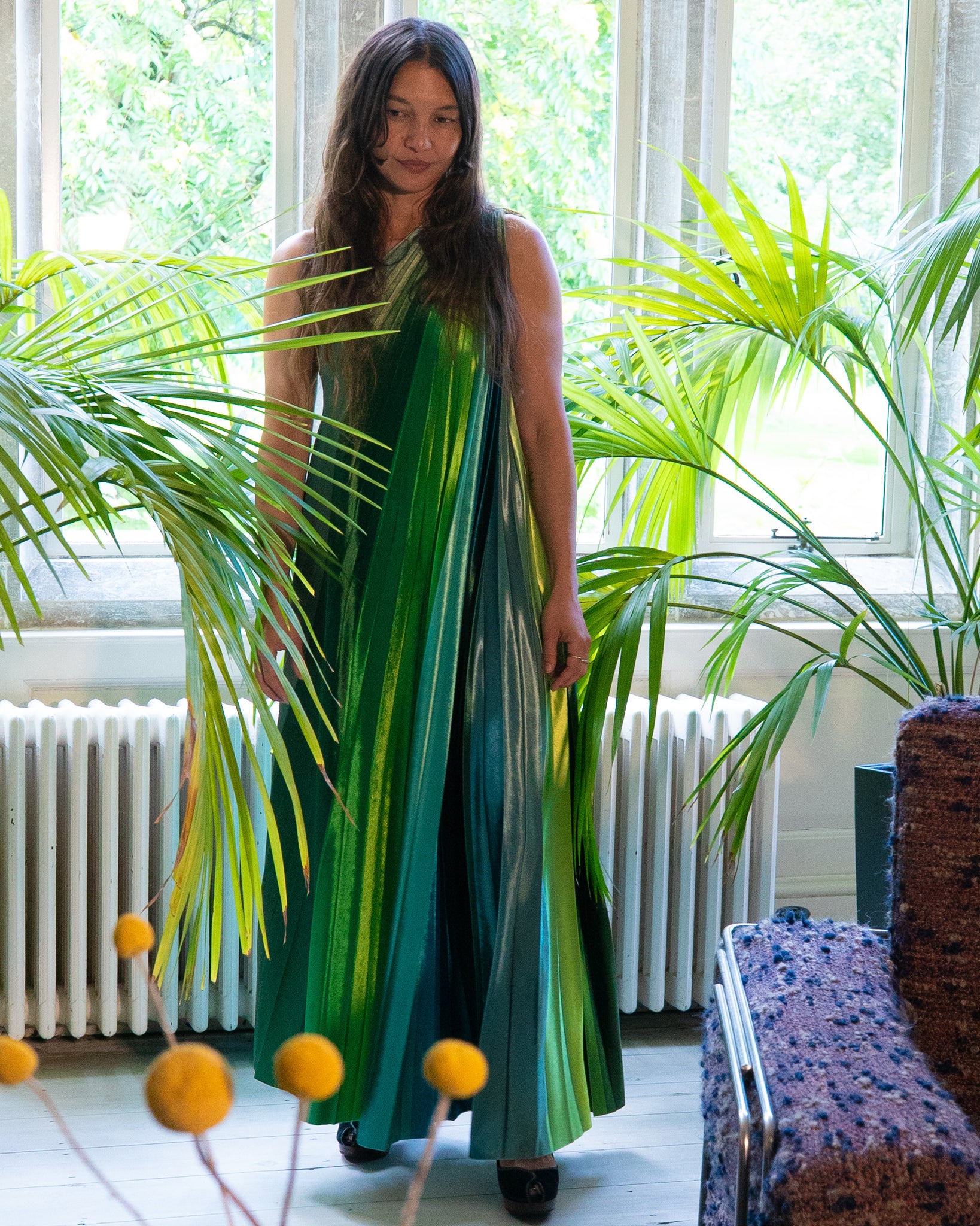 Inspired by the rich, complex greens and folded, fan-like structure of a giant palm leaf, this dress features softly structured pleats and a carefully curated palette of 39 green shades.